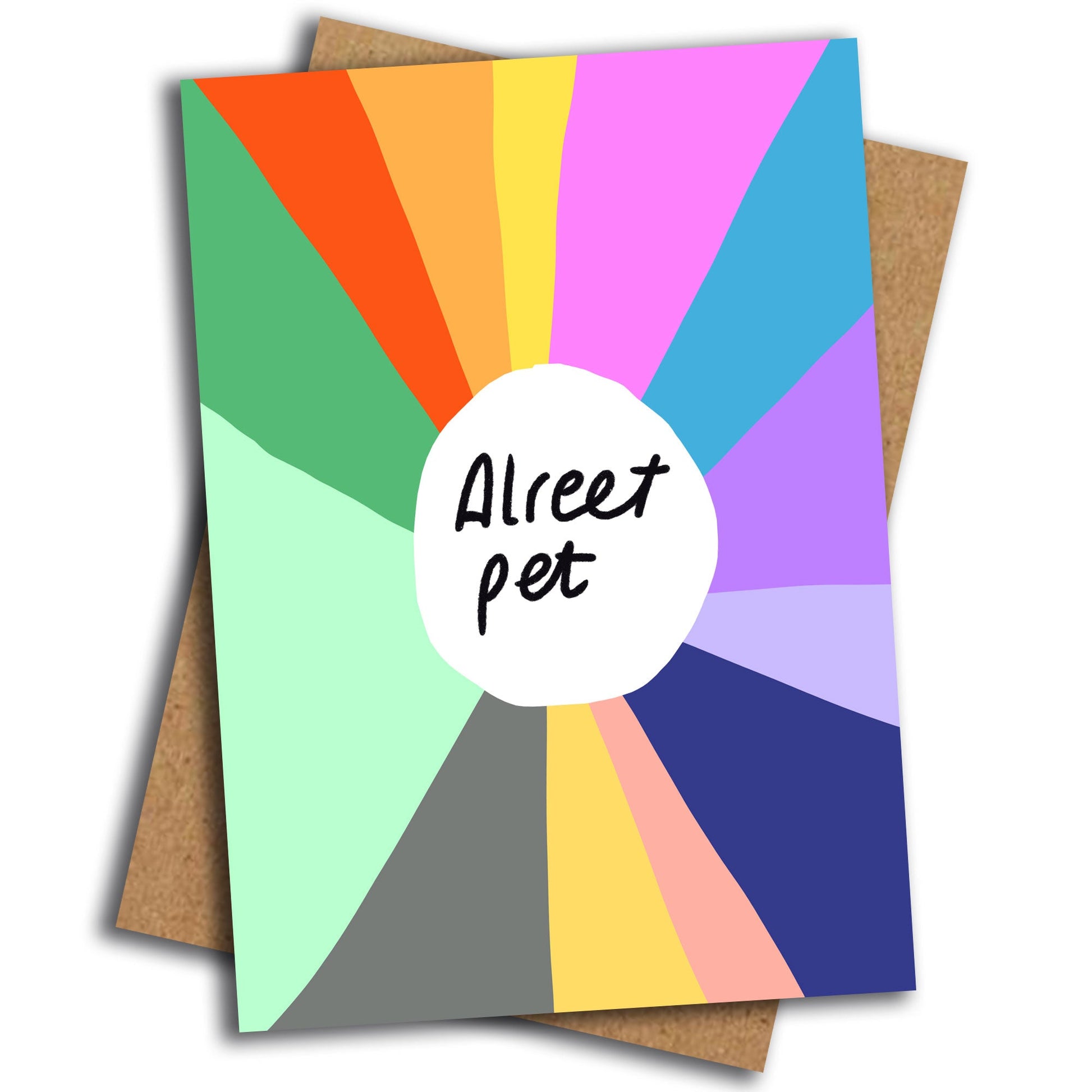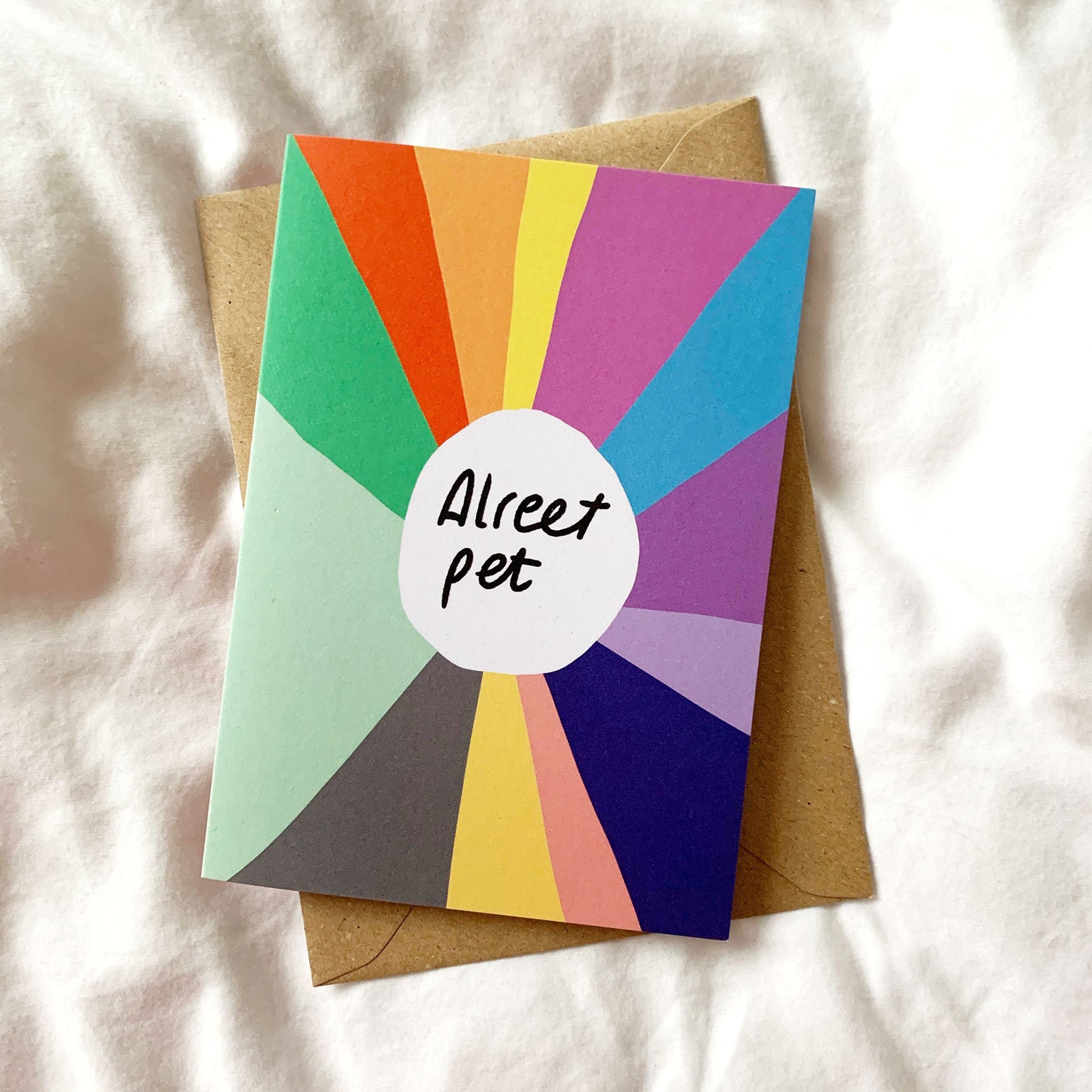 Standard A6 size greeting card designed by Nicola Rowlands and printed in the UK. Proudly printed on recycled card. Will be mailed to you in a hardback envelope and will include a brown recycled paper envelope. Card is blank inside for your own message. Cello bags made from cornstarch and are biodegradable.