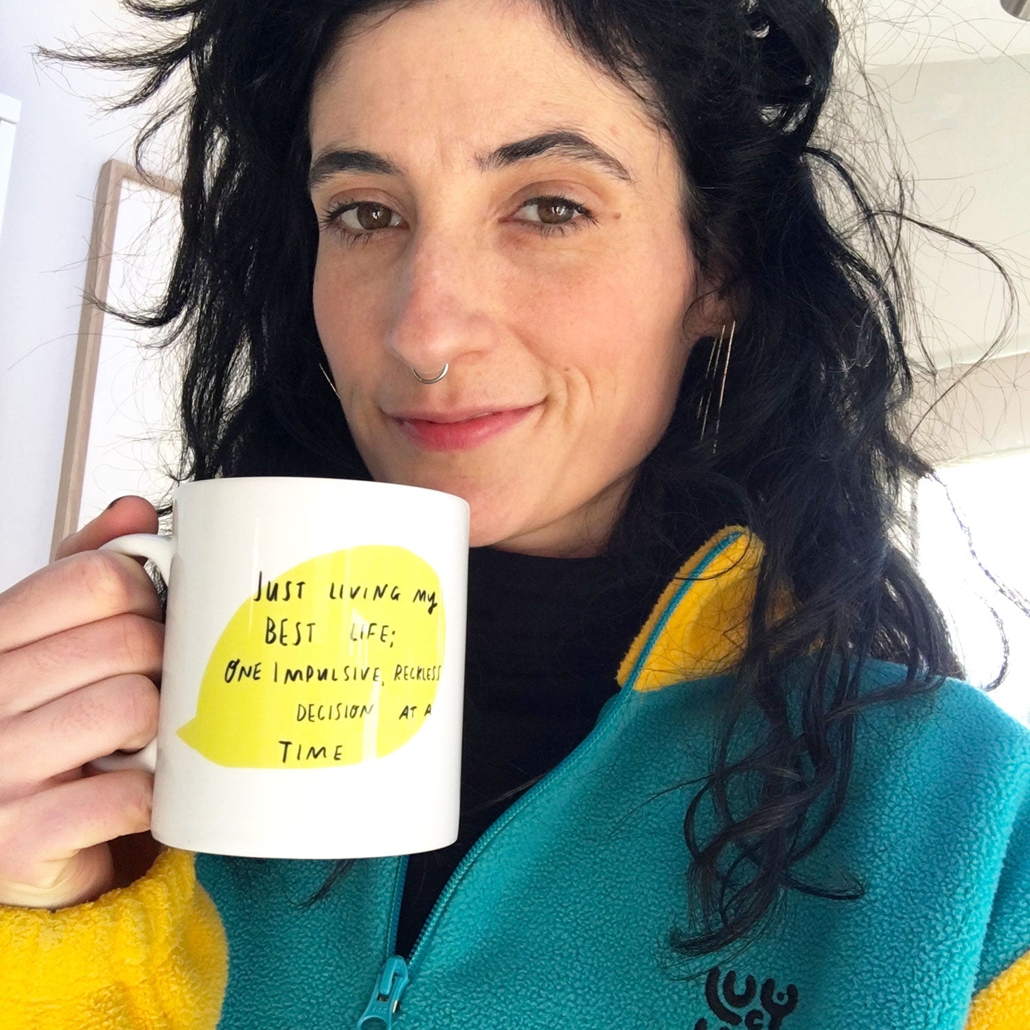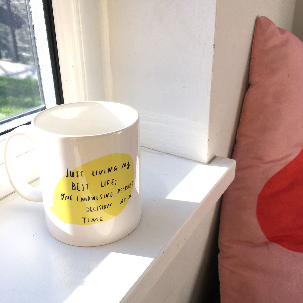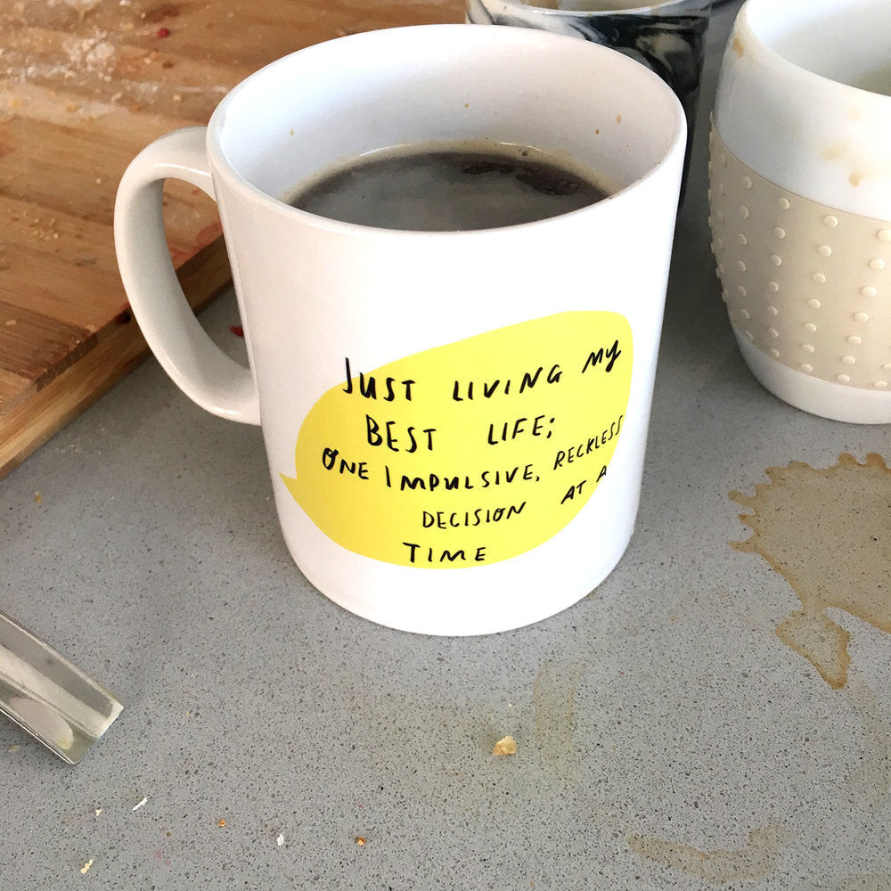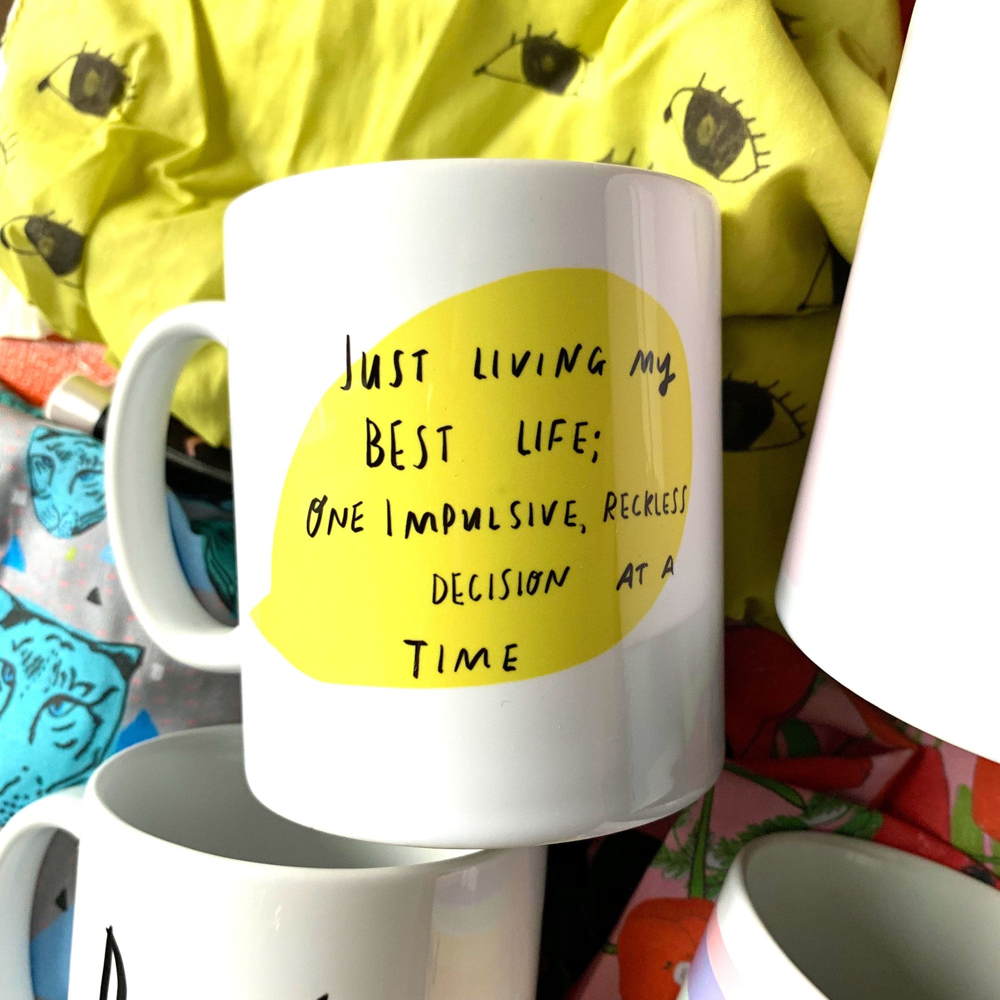 Front reads 'Just living my best life; one impulsive, reckless decision at a time' // Back shows a sunny yellow sunshine.