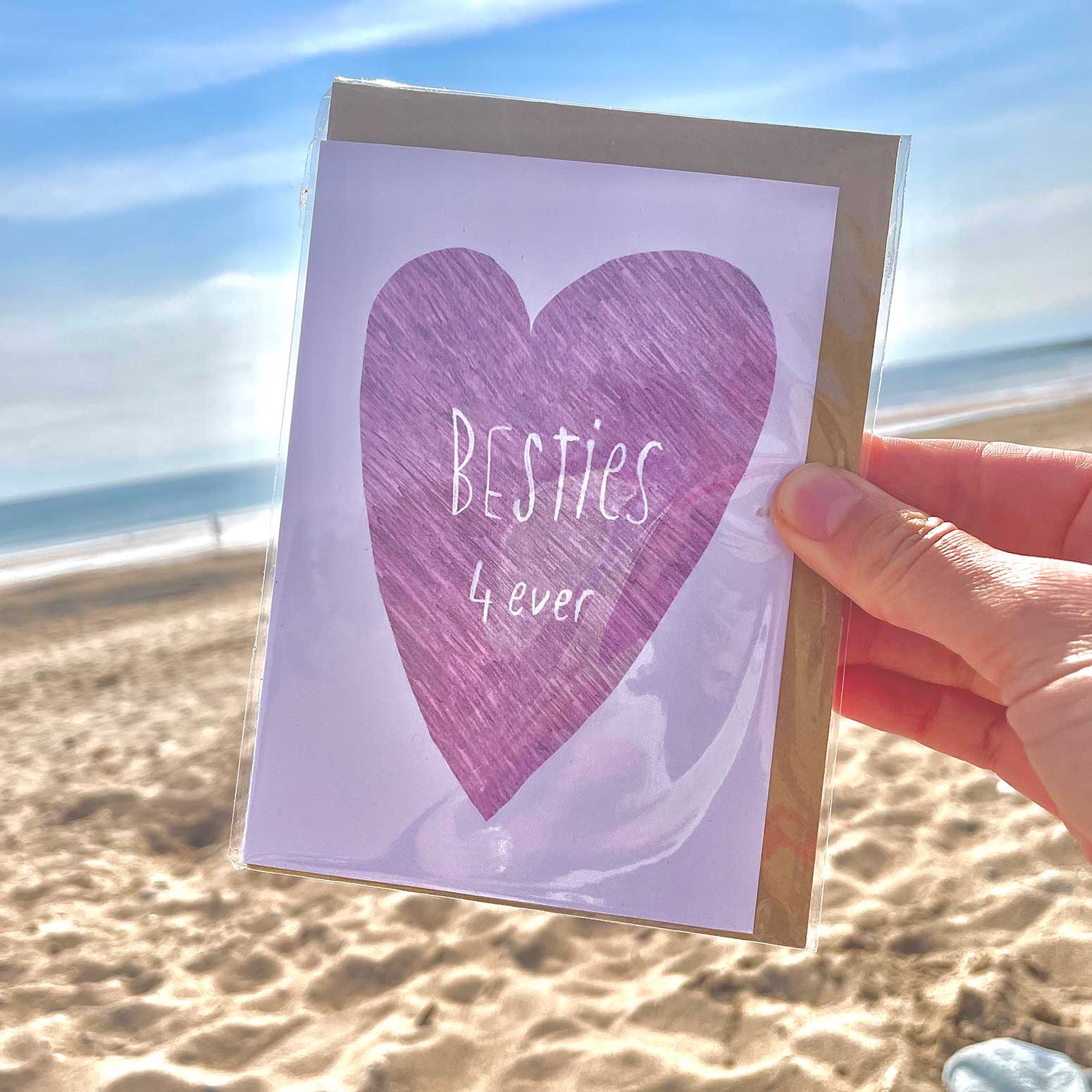 Standard A6 size greeting card designed by Nicola Rowlands and printed in the UK. Proudly printed on recycled card. Will be mailed to you in a hardback envelope and will include a brown recycled paper envelope. Card is blank inside for your own message. Cello bags made from cornstarch and are biodegradable.