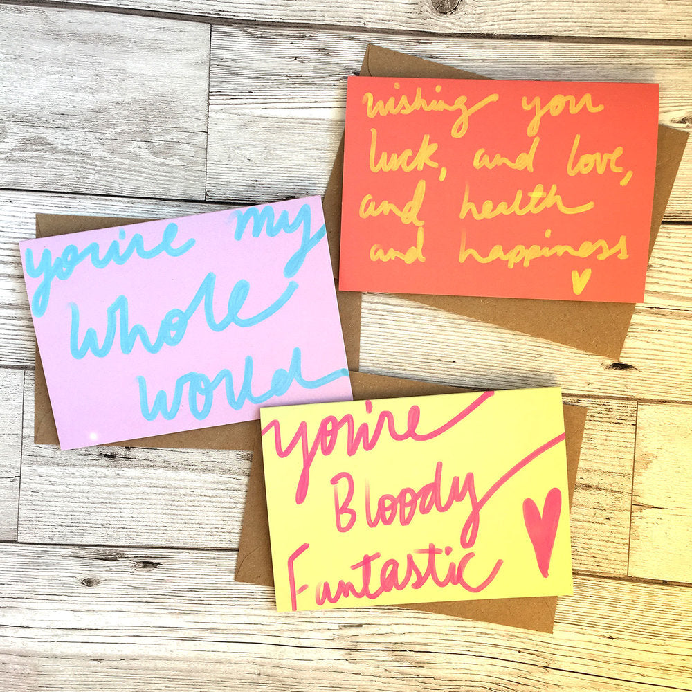 Standard A6 size greeting card designed by Nicola Rowlands and printed in the UK. Proudly printed on recycled card. Will be mailed to you in a hardback envelope and will include a brown recycled paper envelope. Card is blank inside for your own message. Cello bags made from cornstarch and are biodegradable.