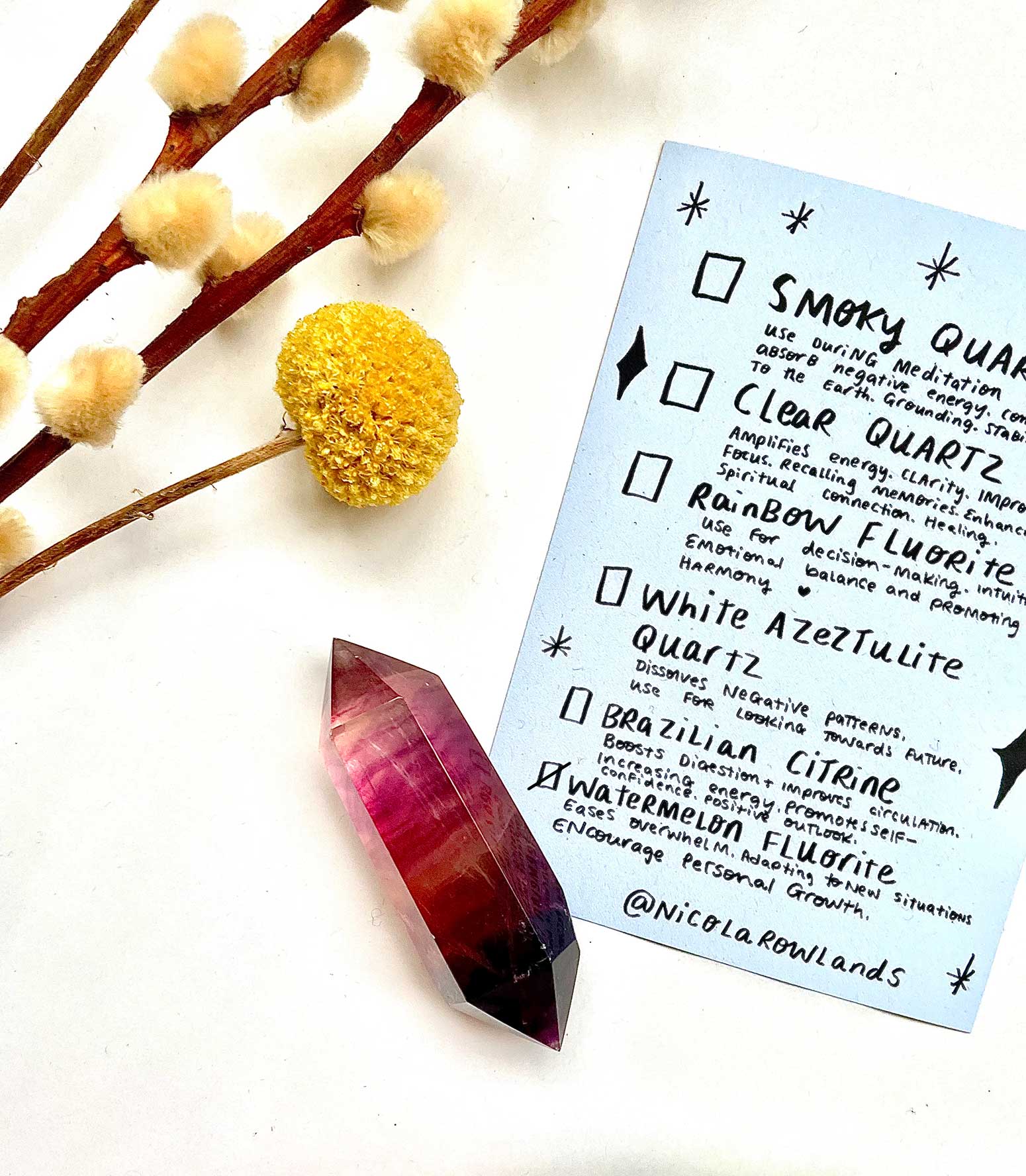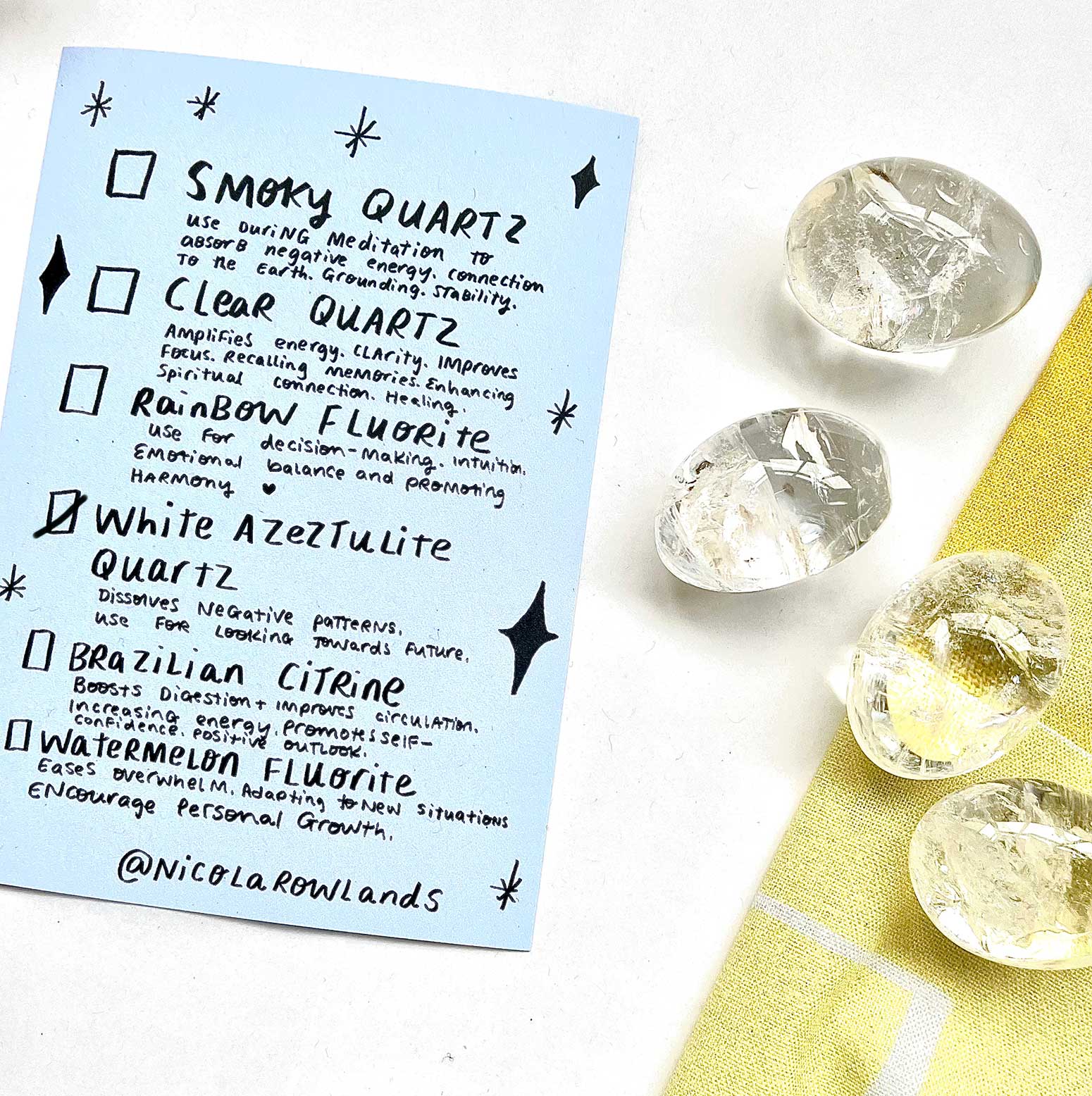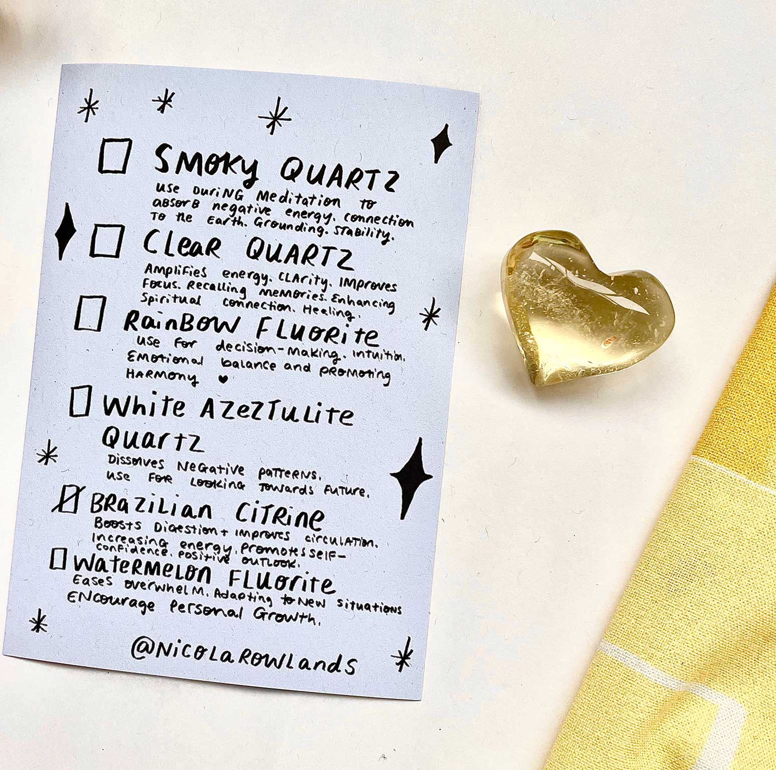 Choose from five different cystals. Your order will arrive in a little fabric bag and will come with a small card explaining which crystal is enclosed and the properties of it.