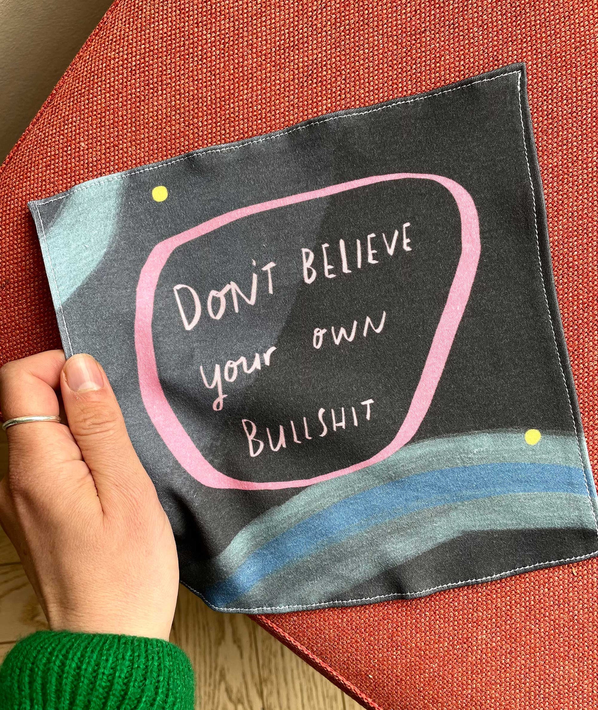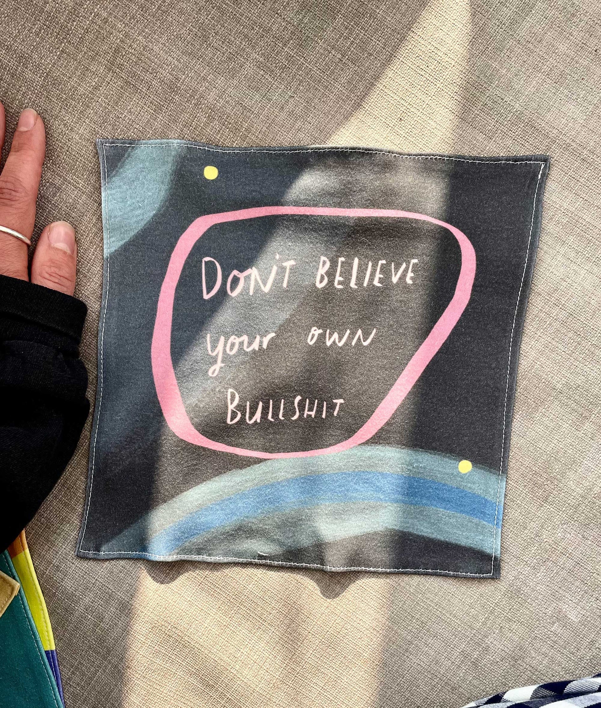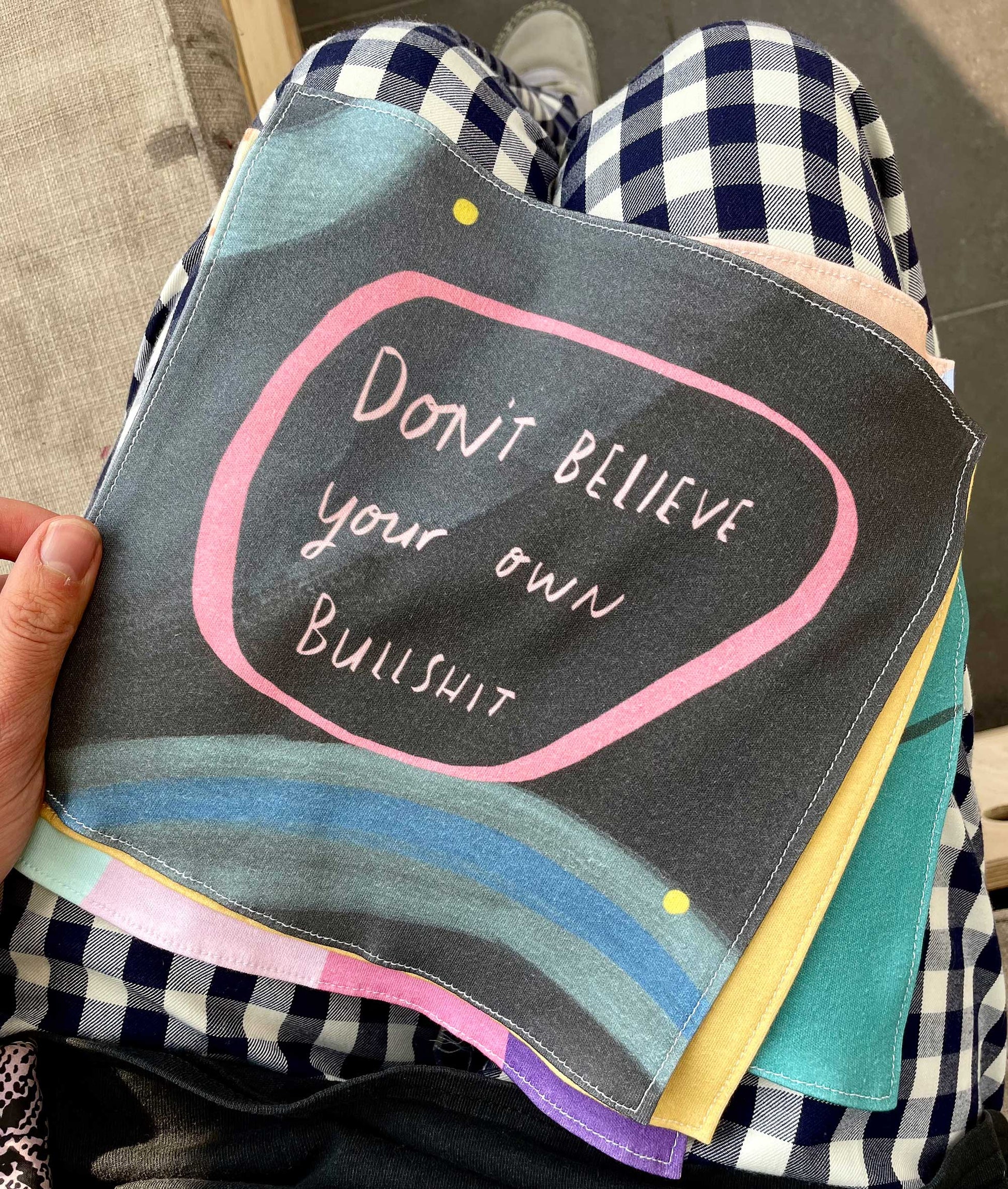 Brand new design for 2025. Ready to wipe snot, tears and cooties. Washable and easily tucked into one's sleeve or pocket for first days and wobbly weeks and tough times. A reminder to get out of your own head because sometimes it's a silly old place in there.