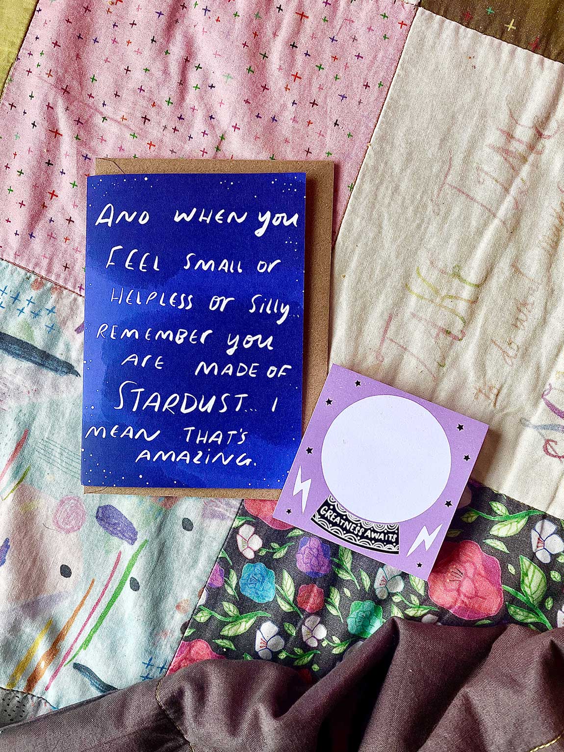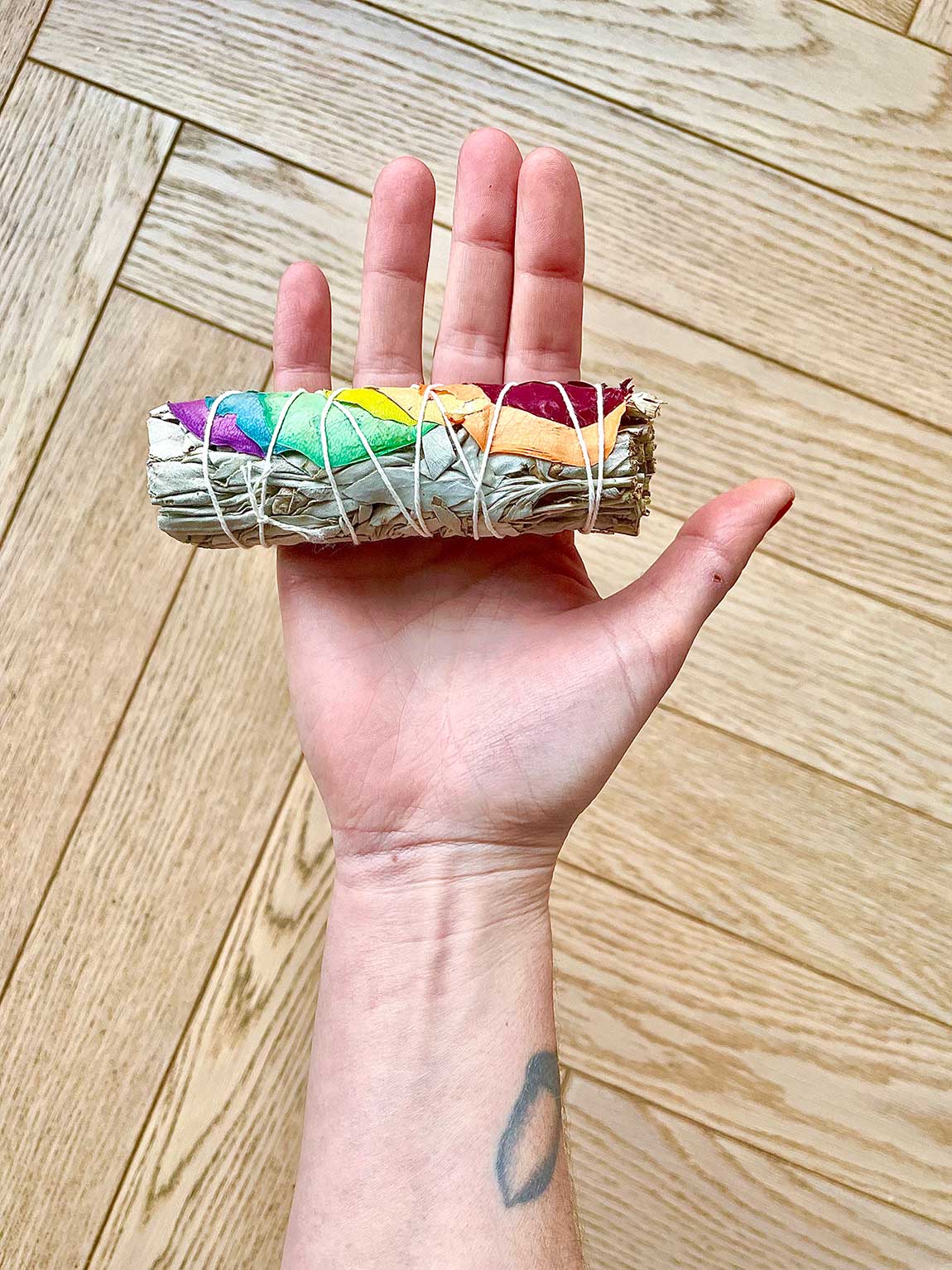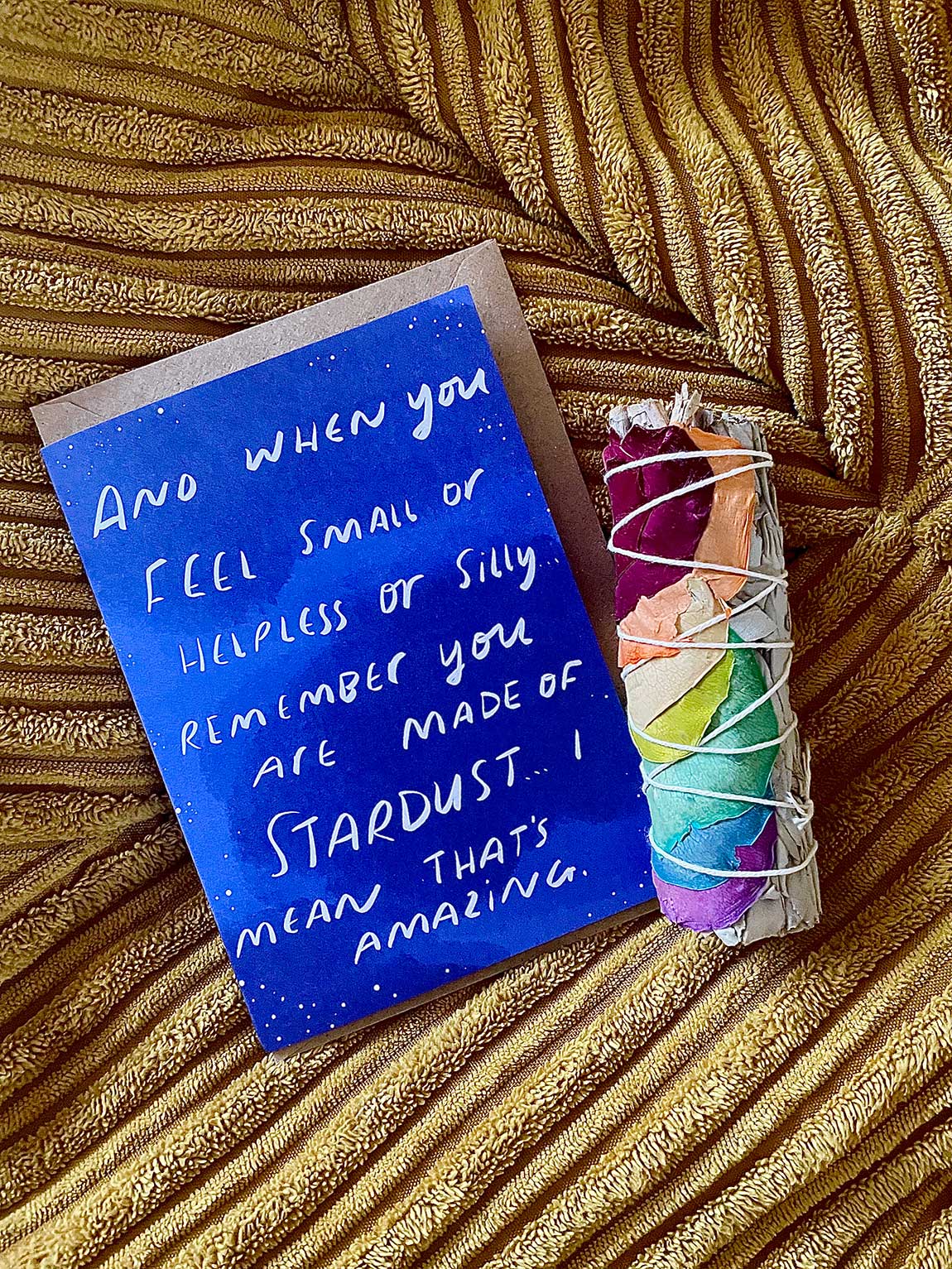 The box will include a greeting card, a post-it pad, and an energy cleansing sage stick - to get you into a spiritual space. Oh, and the book itself - look at that gorgeous cover! For this first box you will also receive a bookmark and a print - not shown - these will be a surprise once you get your box.