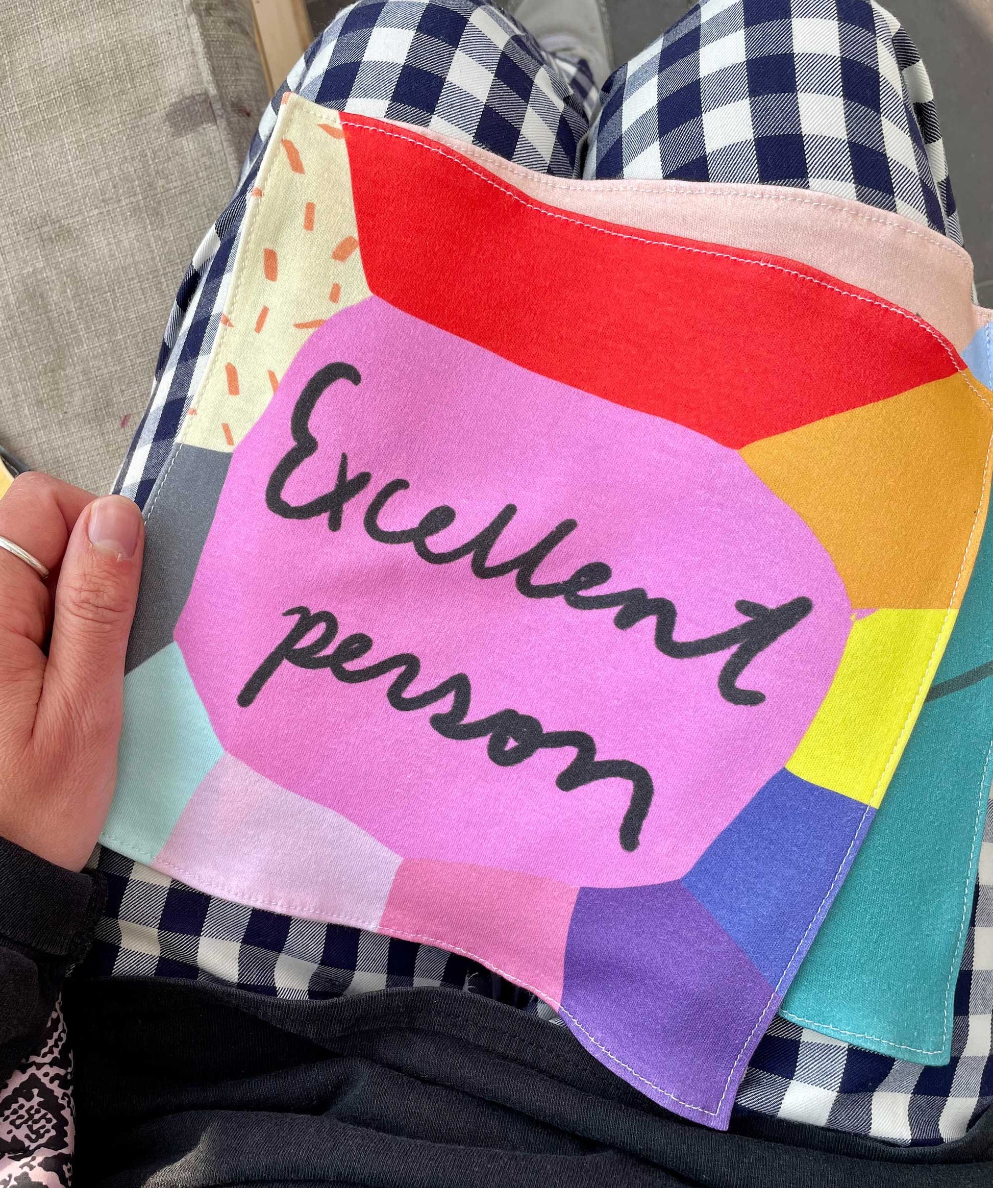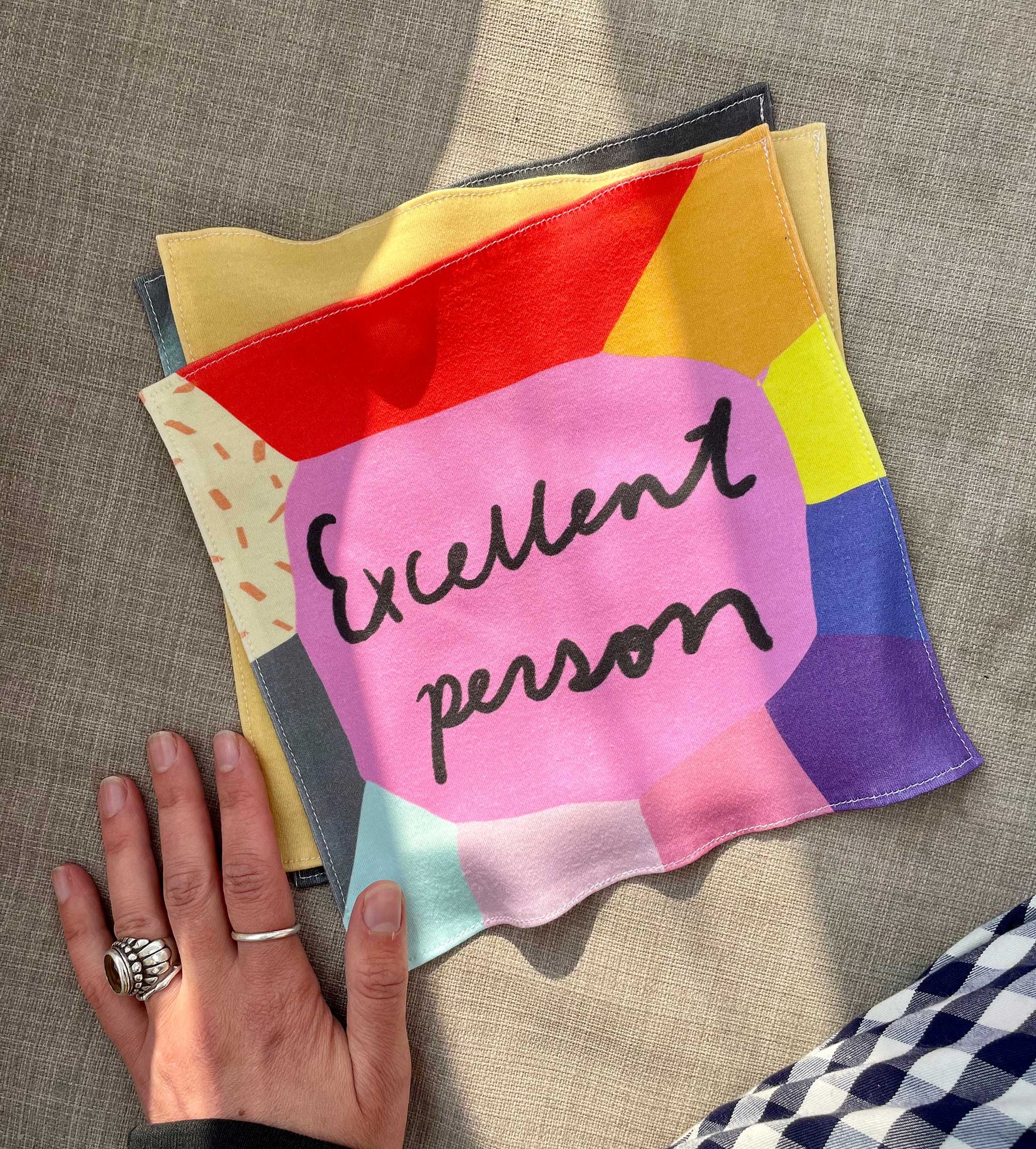 Brand new design for 2025. Ready to wipe snot, tears and cooties. Washable and easily tucked into one's sleeve or pocket for first days and wobbly weeks and tough times. This would also look awesome in a square frame on the wall.