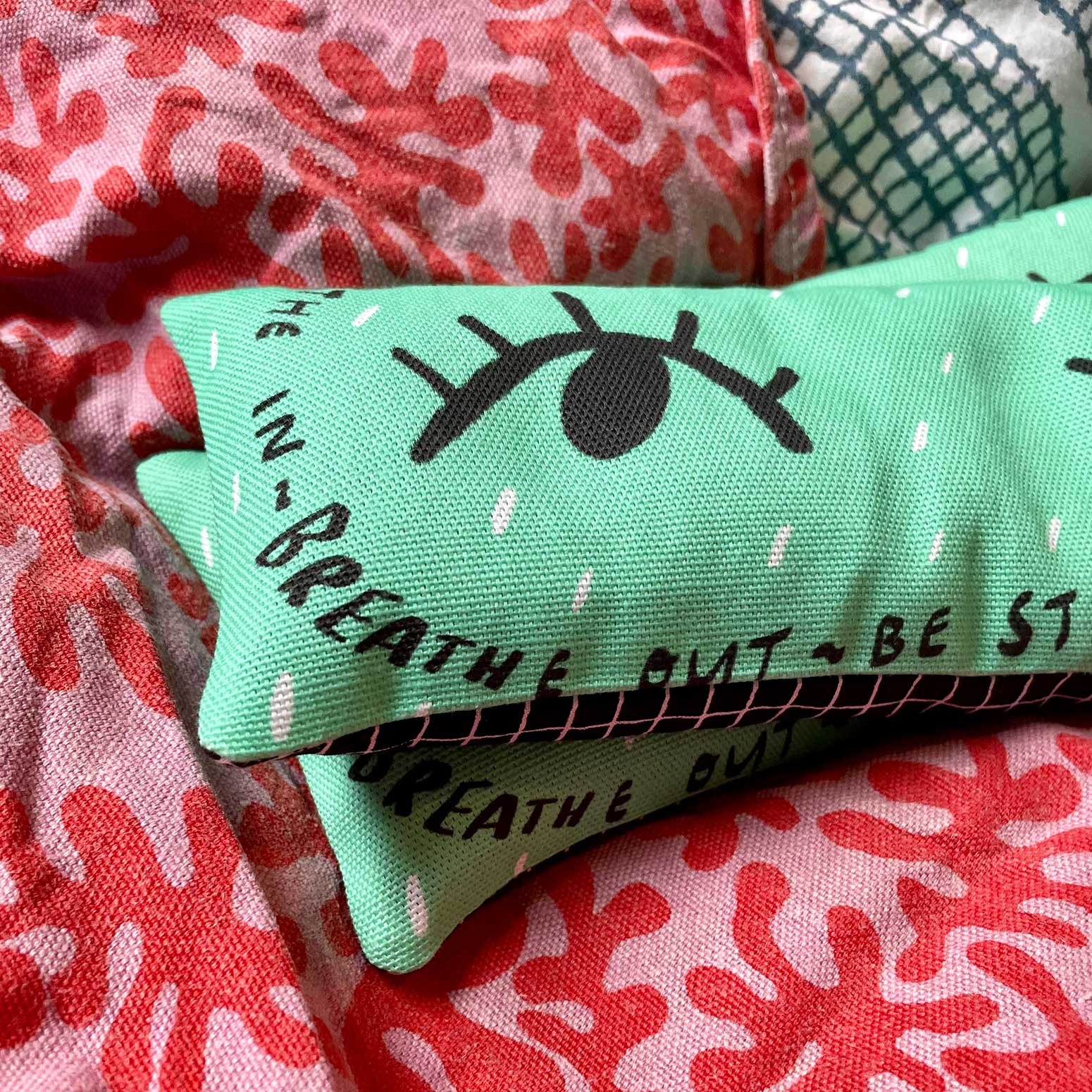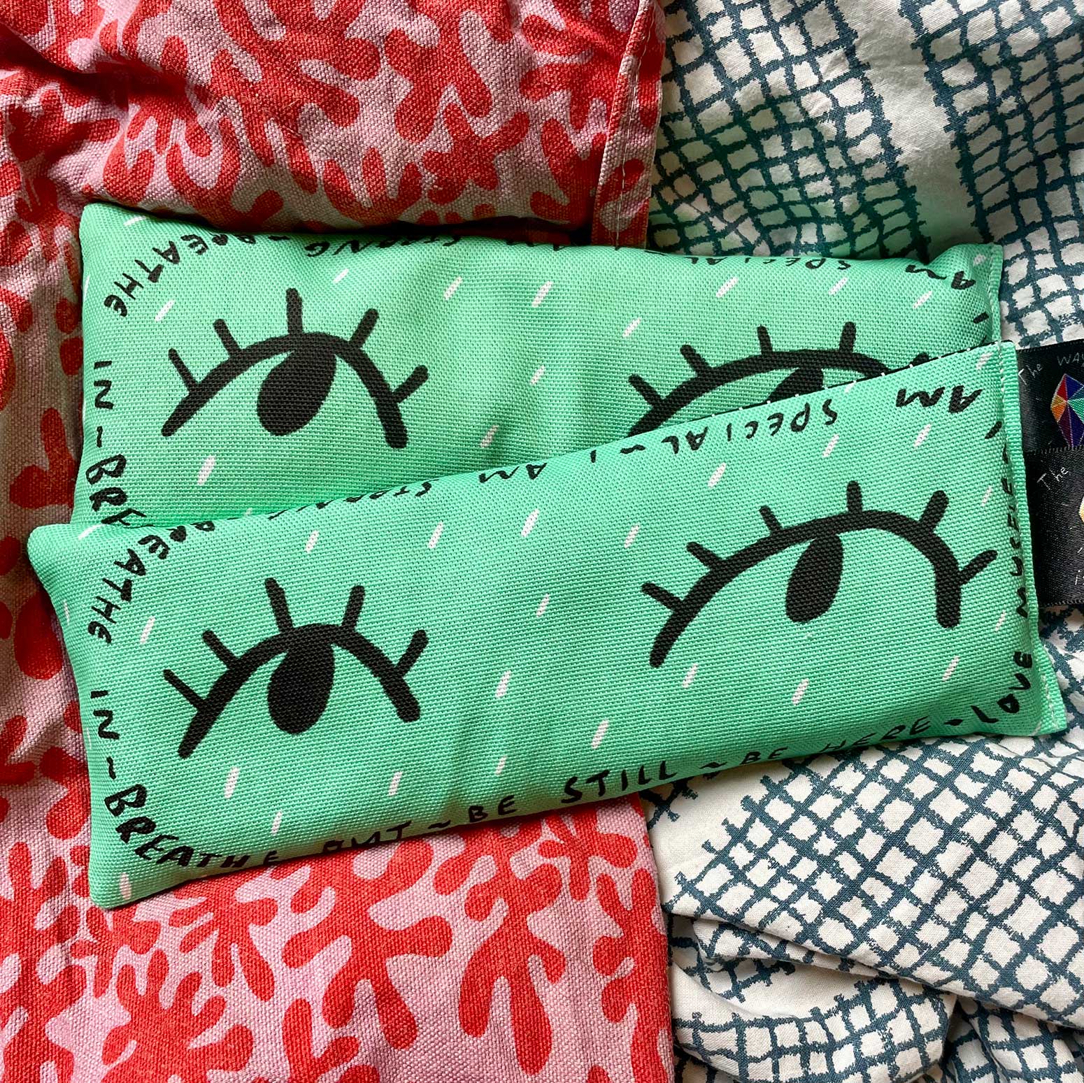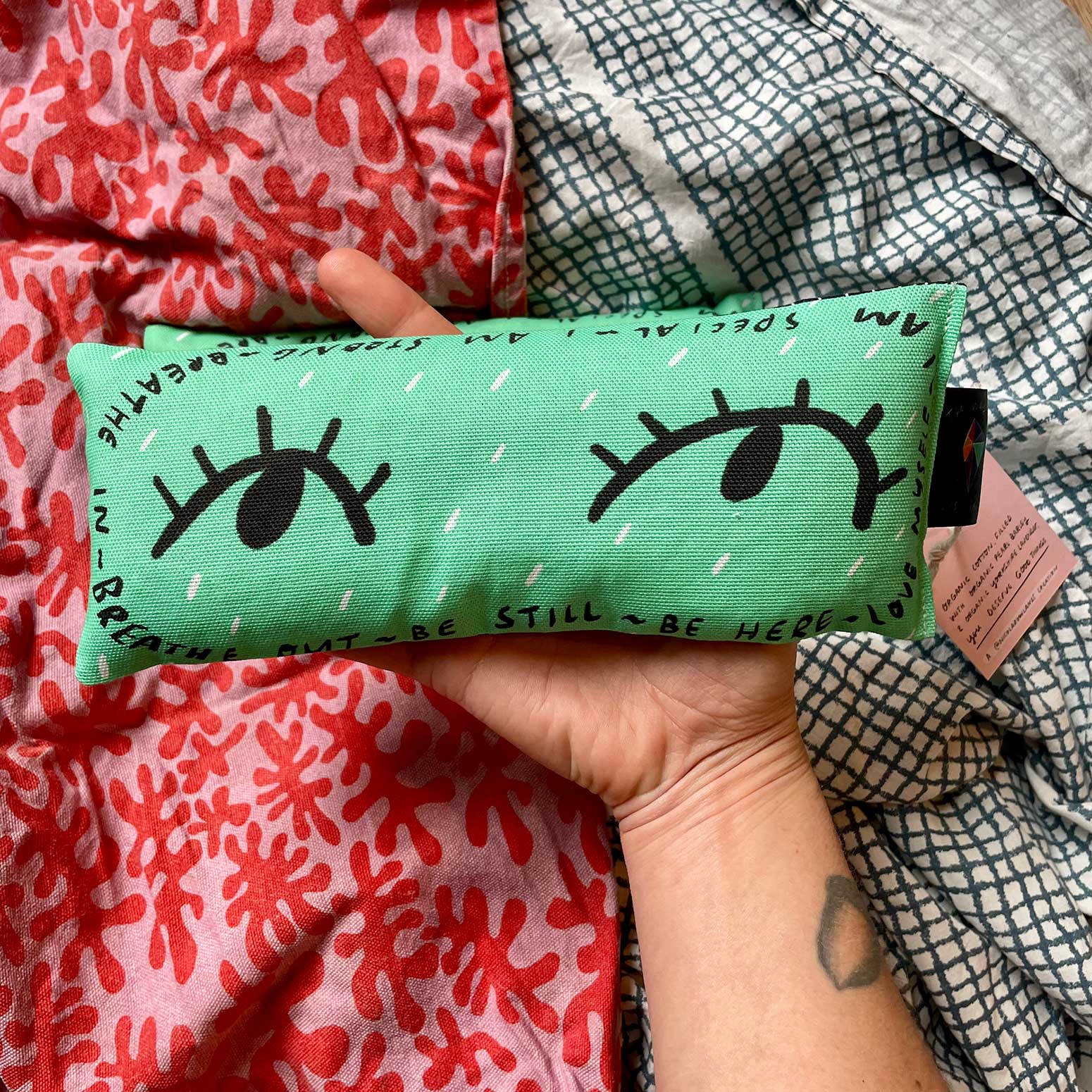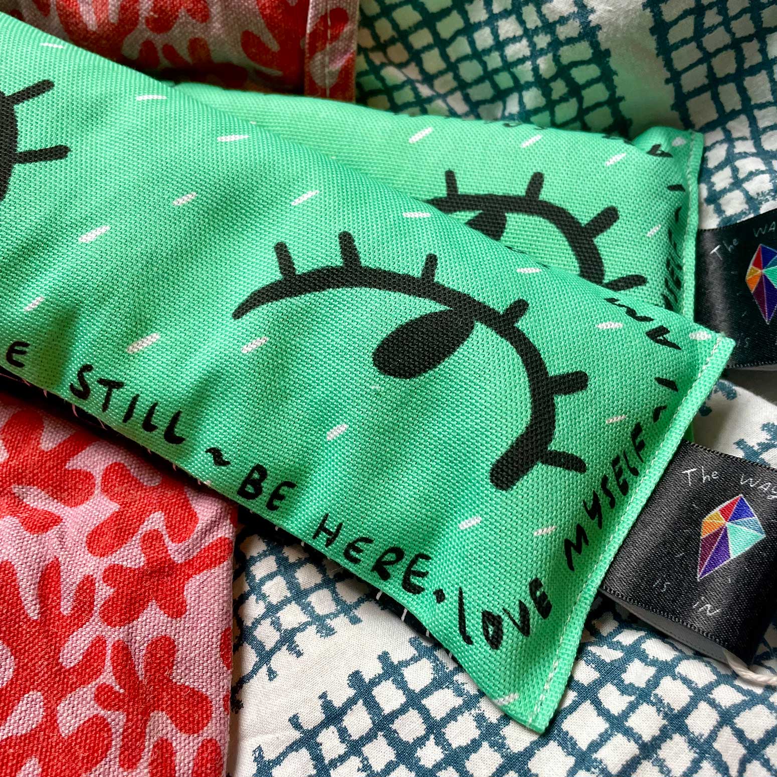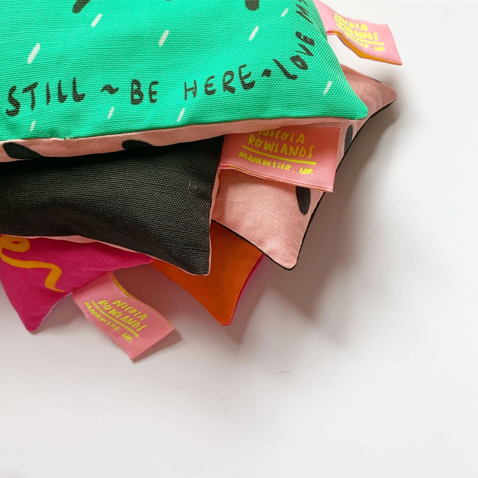 Designed at home using creative magic and Nicola's empathetic touch, then sent to print responsibly in small batches in England. The organic fabric is then hand sew in Manchester UK and finally filled with organic pearl barley and Yorkshire grown organic lavender. We use deadstock fabric for the reverse in beautiful bright colours; we believe this makes the bags a little bit more sustainable.