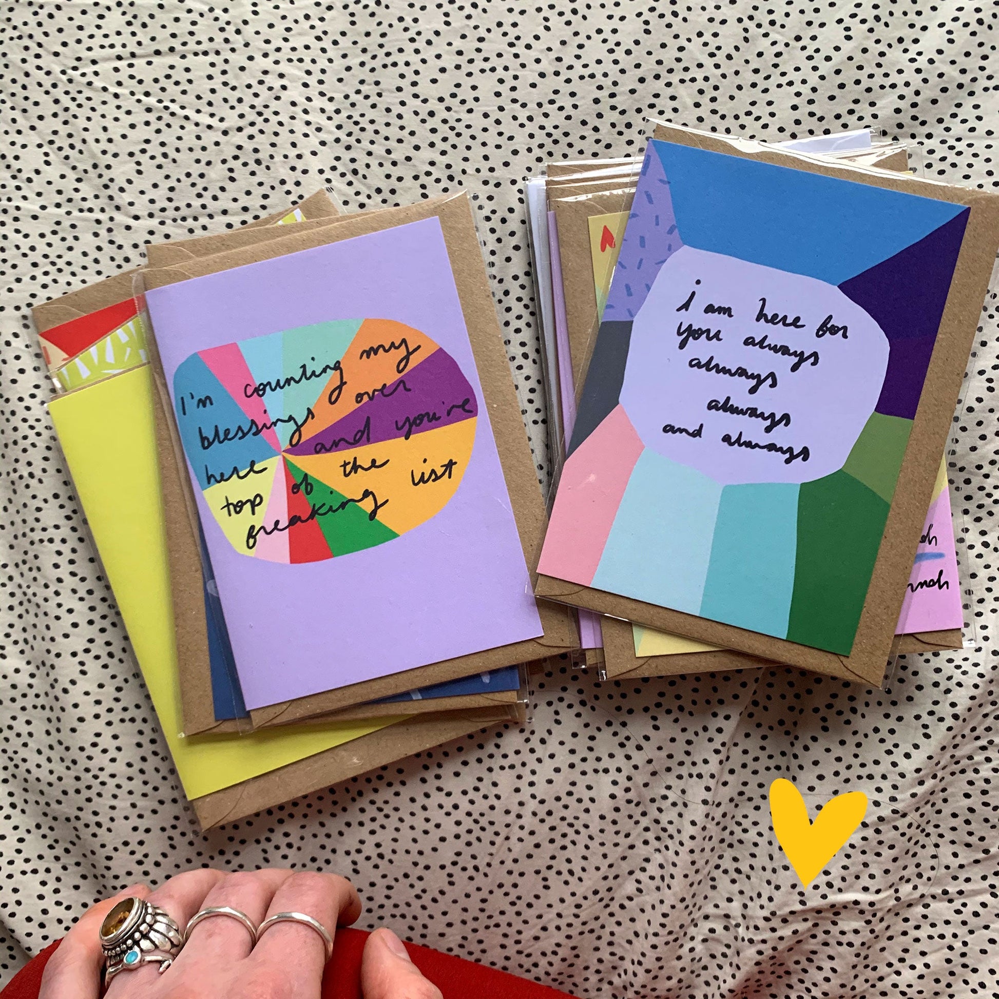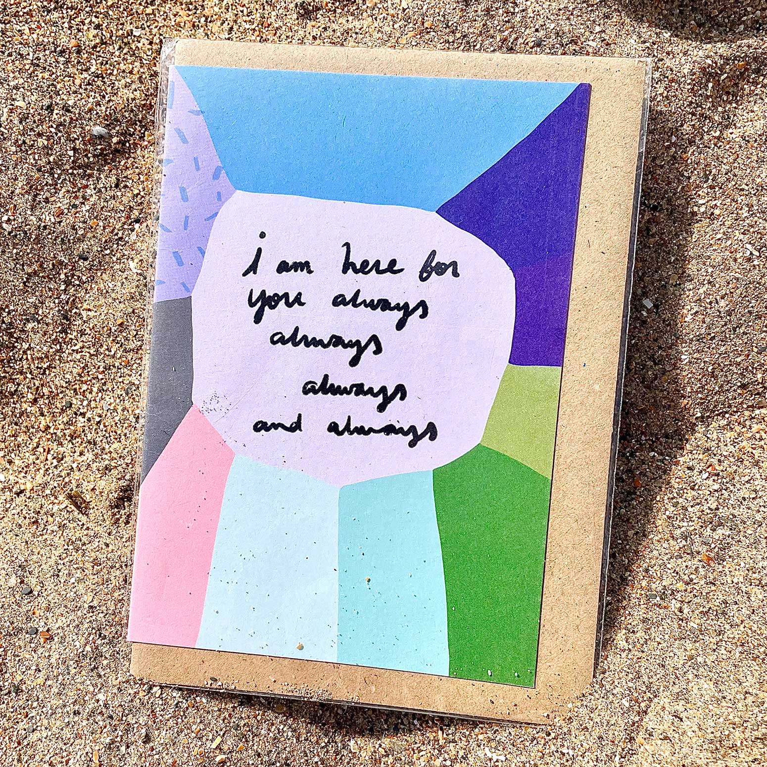 Standard A6 size greeting card designed by Nicola Rowlands and printed in the UK. Proudly printed on recycled card. Will be mailed to you in a hardback envelope and will include a brown recycled paper envelope. Card is blank inside for your own message. Cello bags made from cornstarch and are biodegradable.