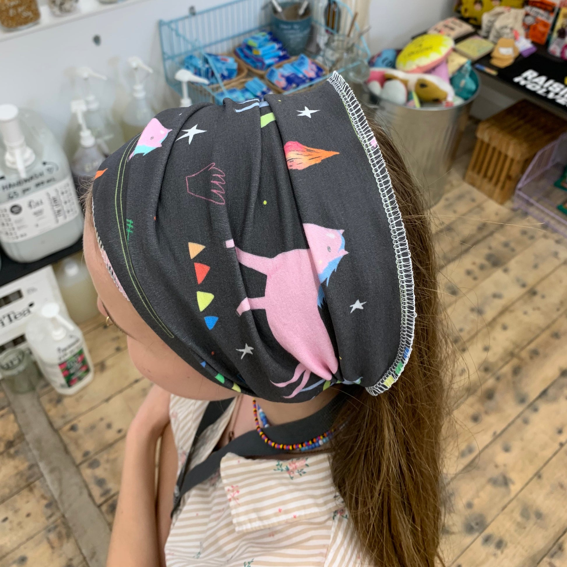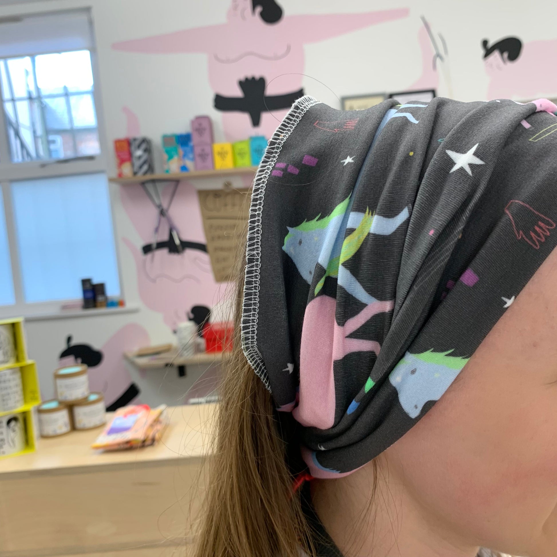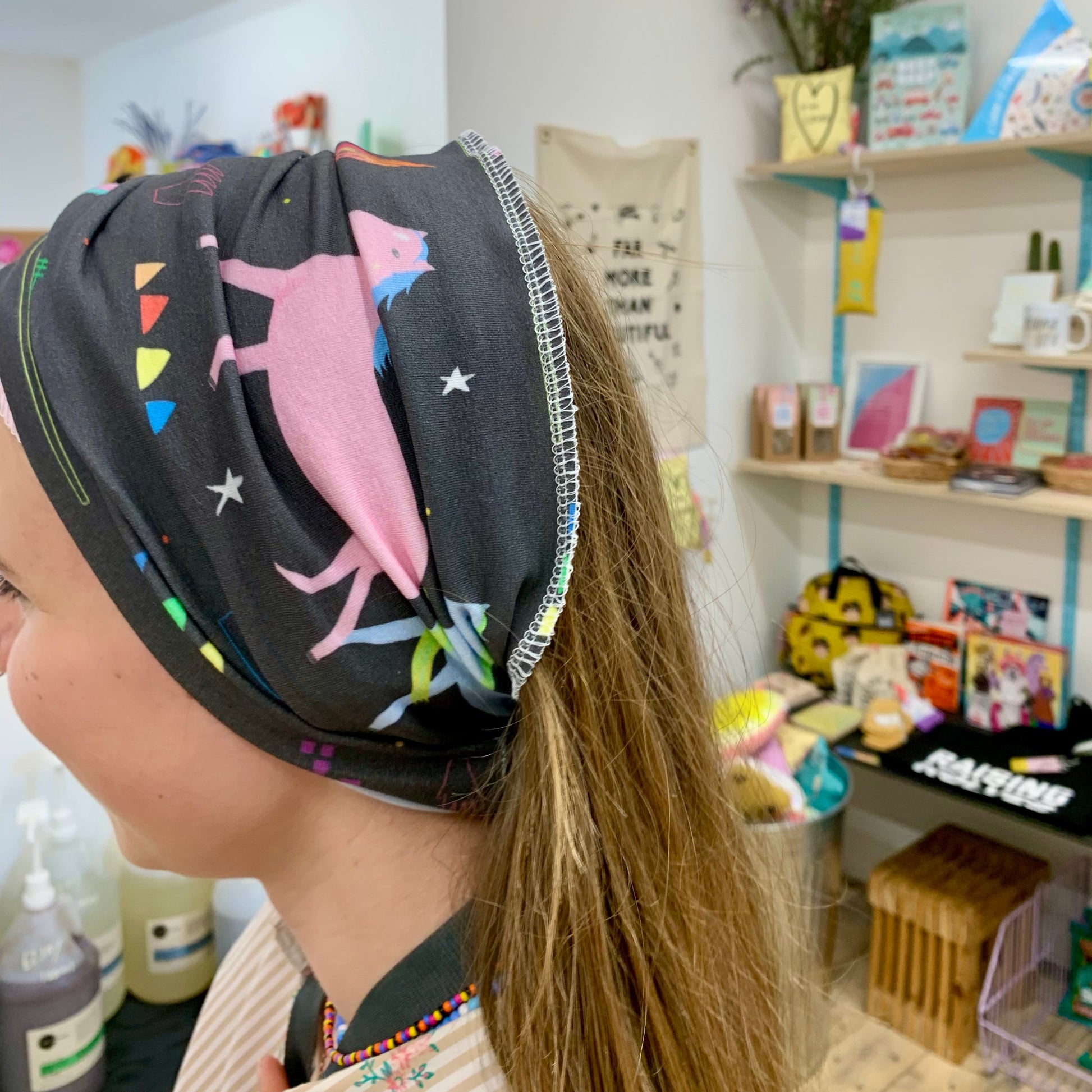 Use it as a headband / neck warmer / hair tie / face mask. Exclusive NR fabric, hand sewn in Manchester