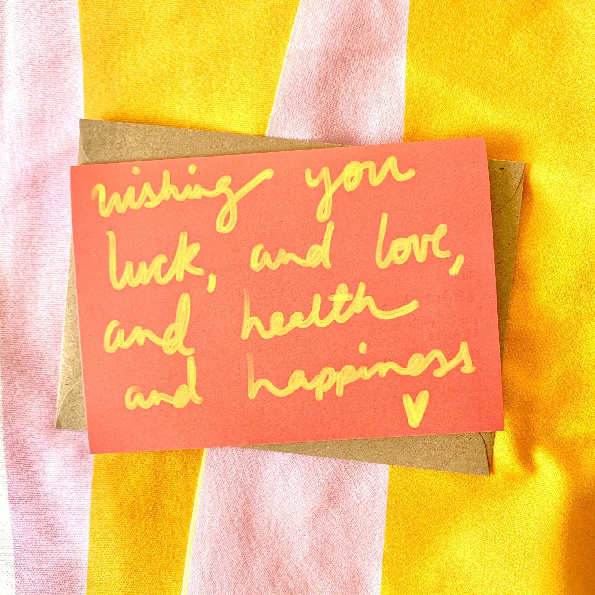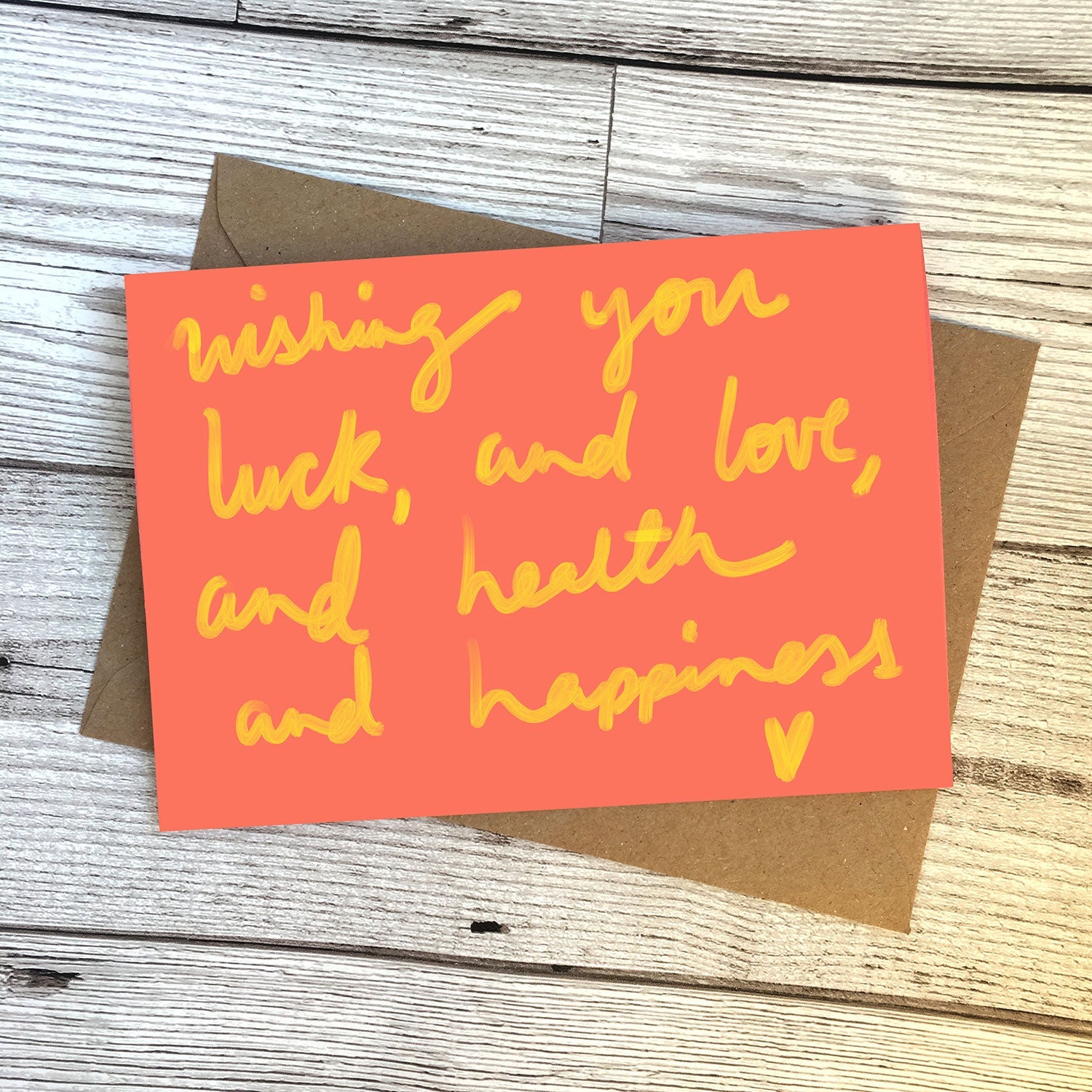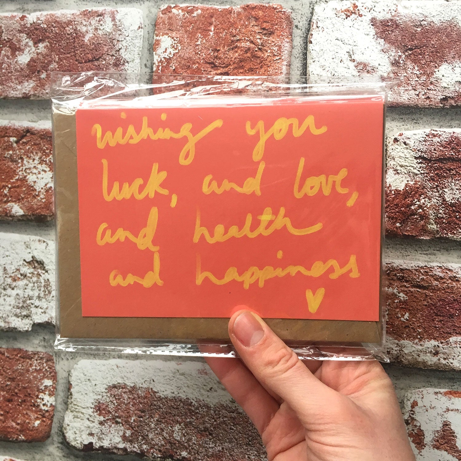 Standard A6 size greeting card designed by Nicola Rowlands and printed in the UK. Proudly printed on recycled card. Will be mailed to you in a hardback envelope and will include a brown recycled paper envelope. Card is blank inside for your own message. Cello bags made from cornstarch and are biodegradable.
