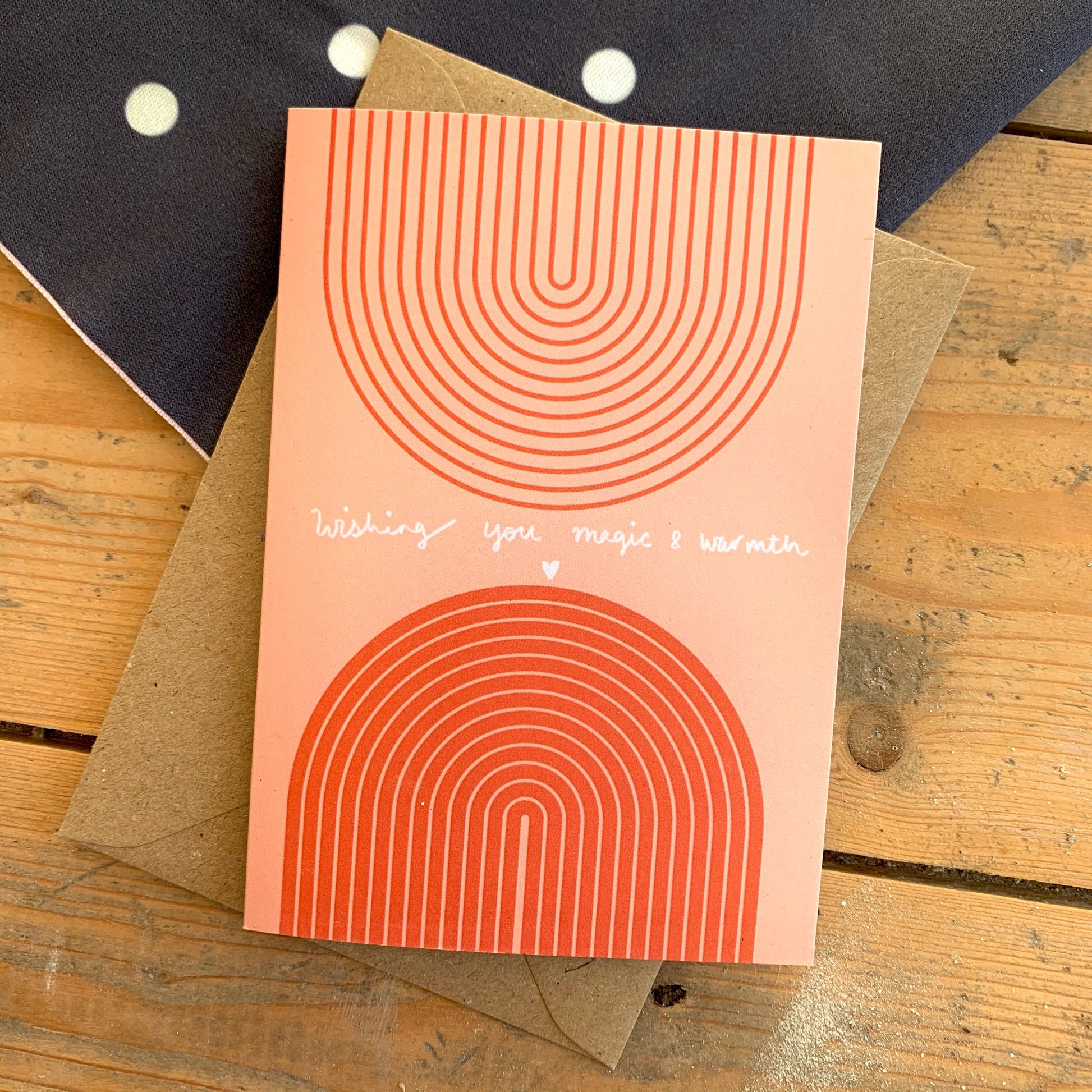Standard A6 size greeting card designed by Nicola Rowlands and printed in the UK. Proudly printed on recycled card. Will be mailed to you in a hardback envelope and will include a brown recycled paper envelope. Card is blank inside for your own message. Cello bags made from cornstarch and are biodegradable.