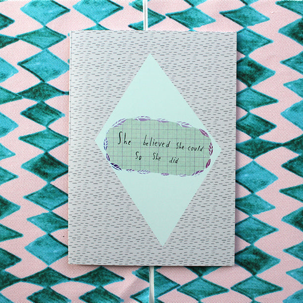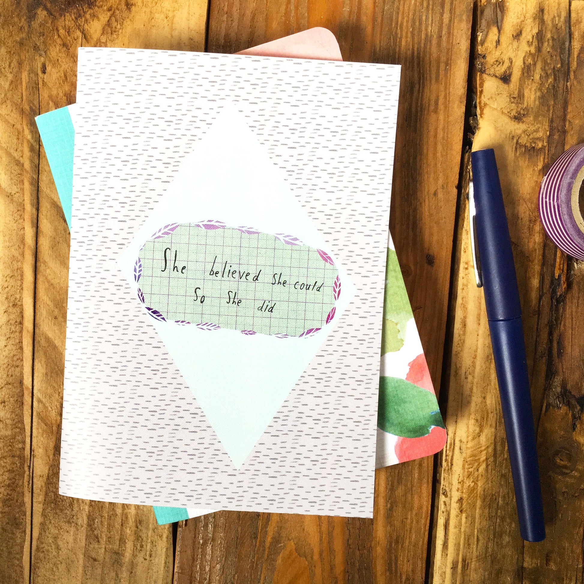 Standard A6 size greeting card designed by Nicola Rowlands and printed in the UK. Proudly printed on recycled card. Will be mailed to you in a hardback envelope and will include a brown recycled paper envelope. Card is blank inside for your own message. Cello bags made from cornstarch and are biodegradable.