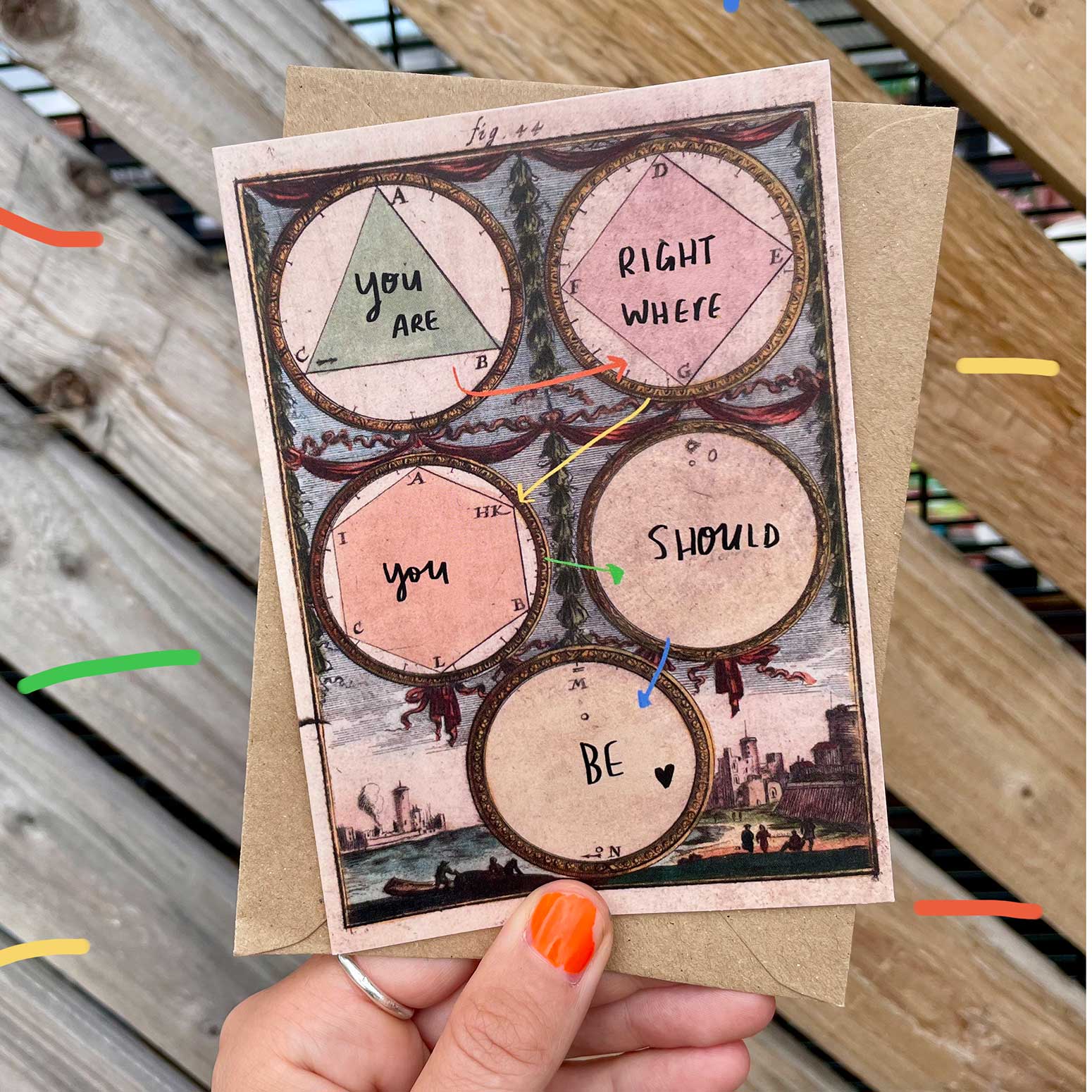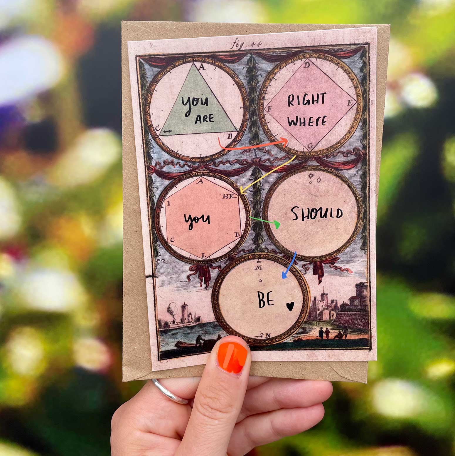 Standard A6 size greeting card designed by Nicola Rowlands and printed in the UK. Proudly printed on recycled card. Will be mailed to you in a hardback envelope and will include a brown recycled paper envelope. Card is blank inside for your own message. Cello bags made from cornstarch and are biodegradable.