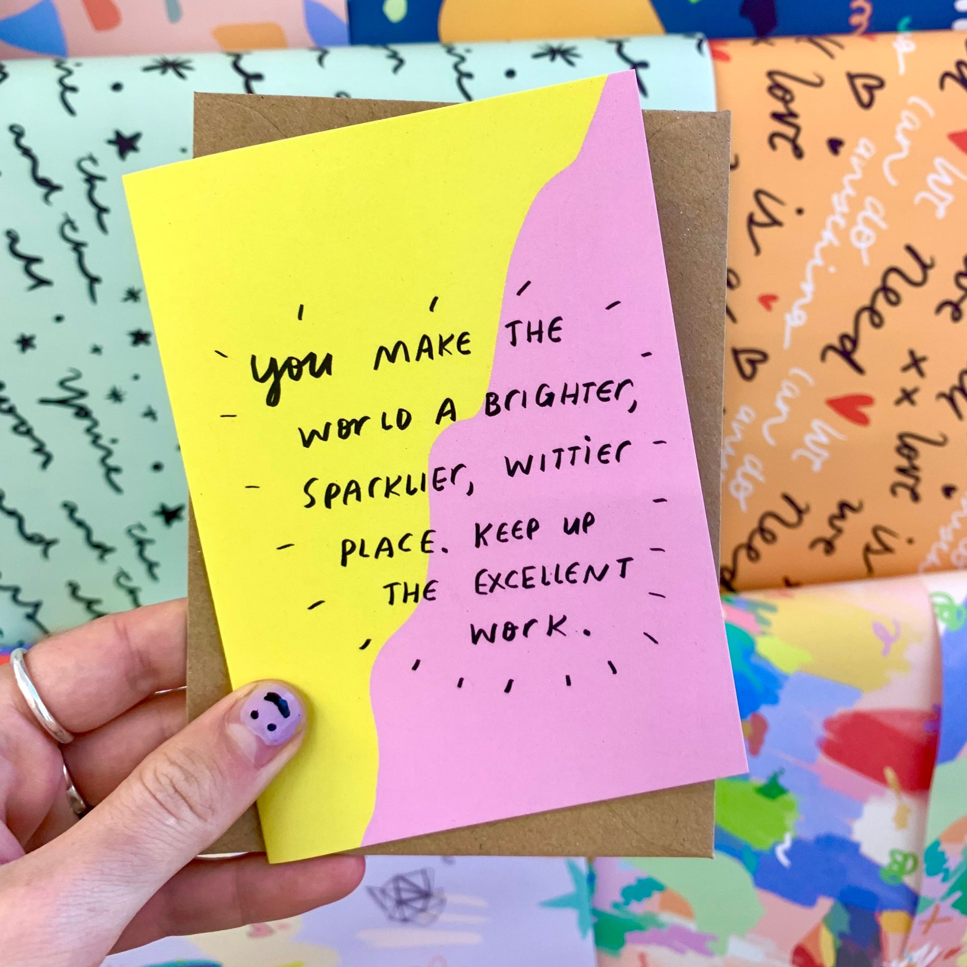 Standard A6 size greeting card designed by Nicola Rowlands and printed in the UK. Proudly printed on recycled card. Will be mailed to you in a hardback envelope and will include a brown recycled paper envelope. Card is blank inside for your own message. Cello bags made from cornstarch and are biodegradable.